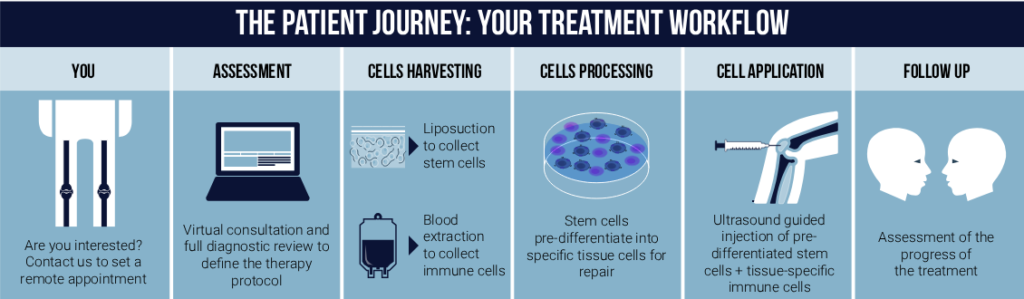 Two types of cells are needed for the treatment: stem cells and tissue-specific effector lymphocytes. The stem cells are extracted from subcutaneous fat, which is done by performing a micro liposuction procedure that only needs local anesthesia. Immune cells are obtained from the patient’s peripheral blood.